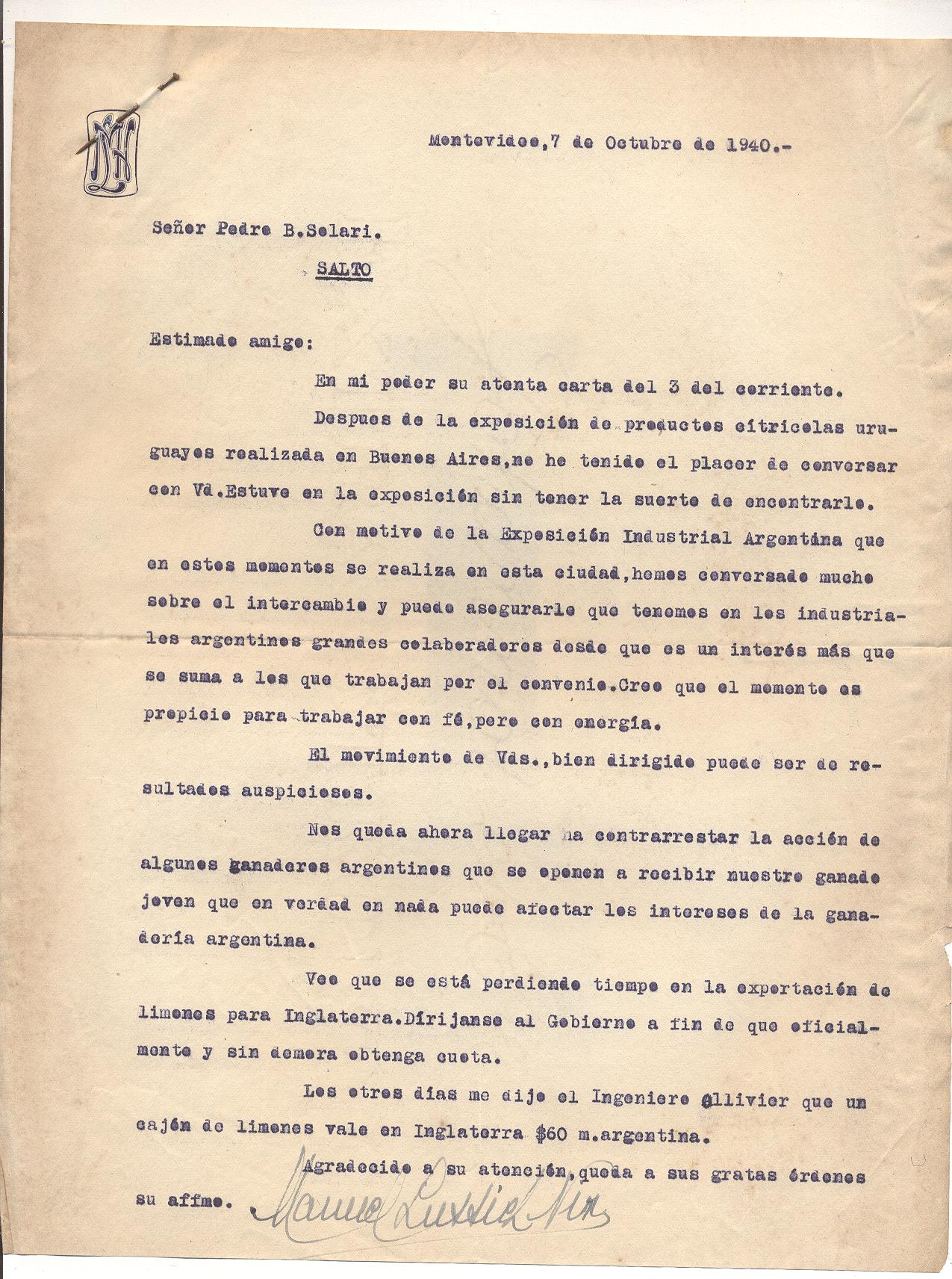 A su regreso de Estados Unidos colabora con una Exposición Citrícola que se organizó en la Sociedad Fomento de Salto de la que era vicepresidente.