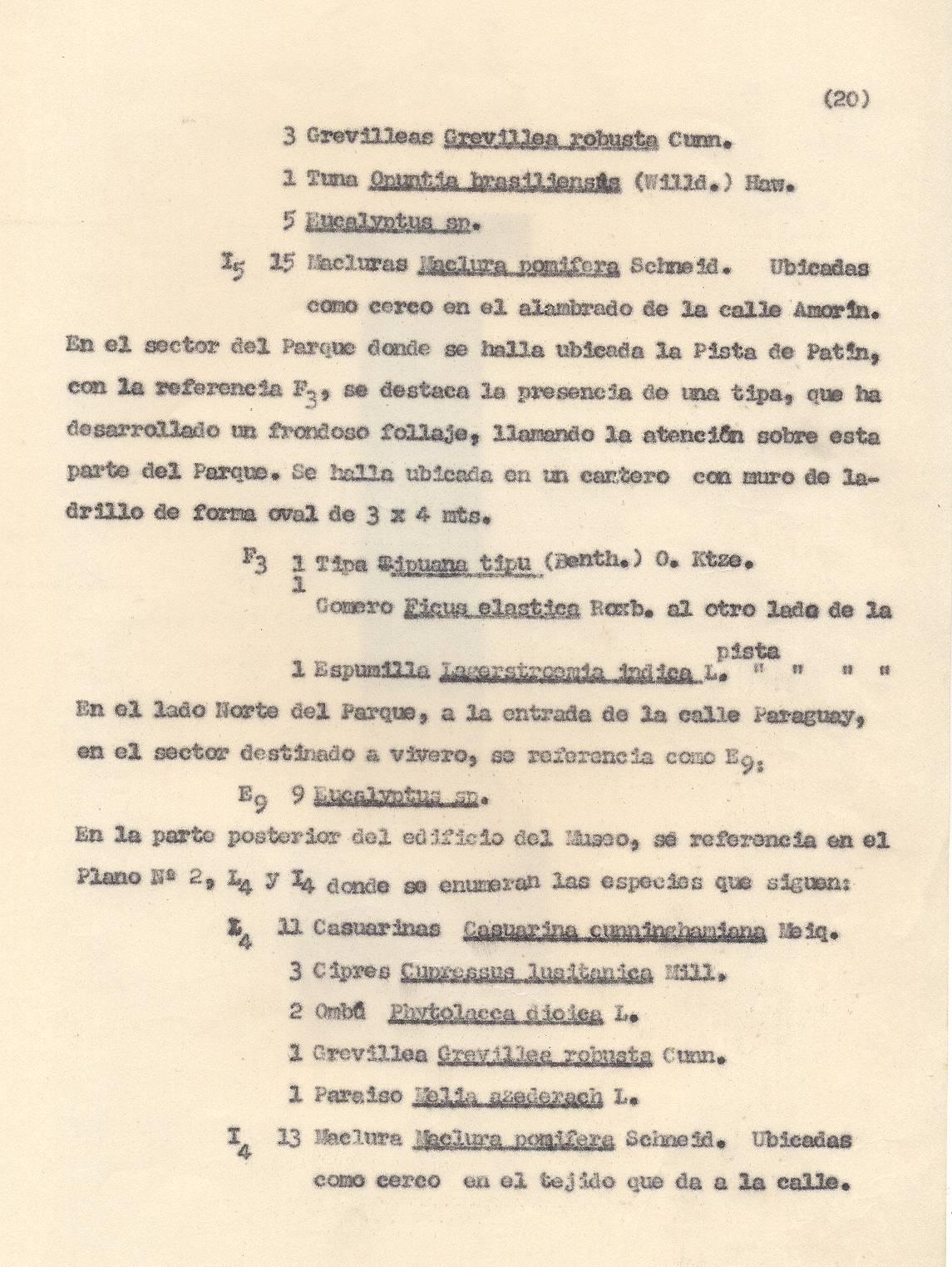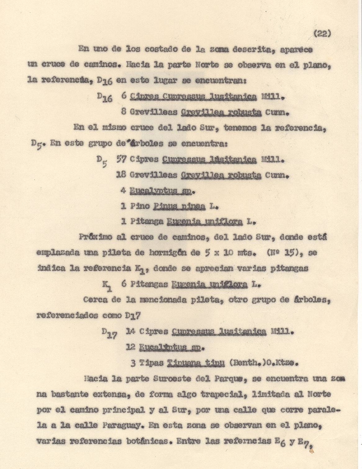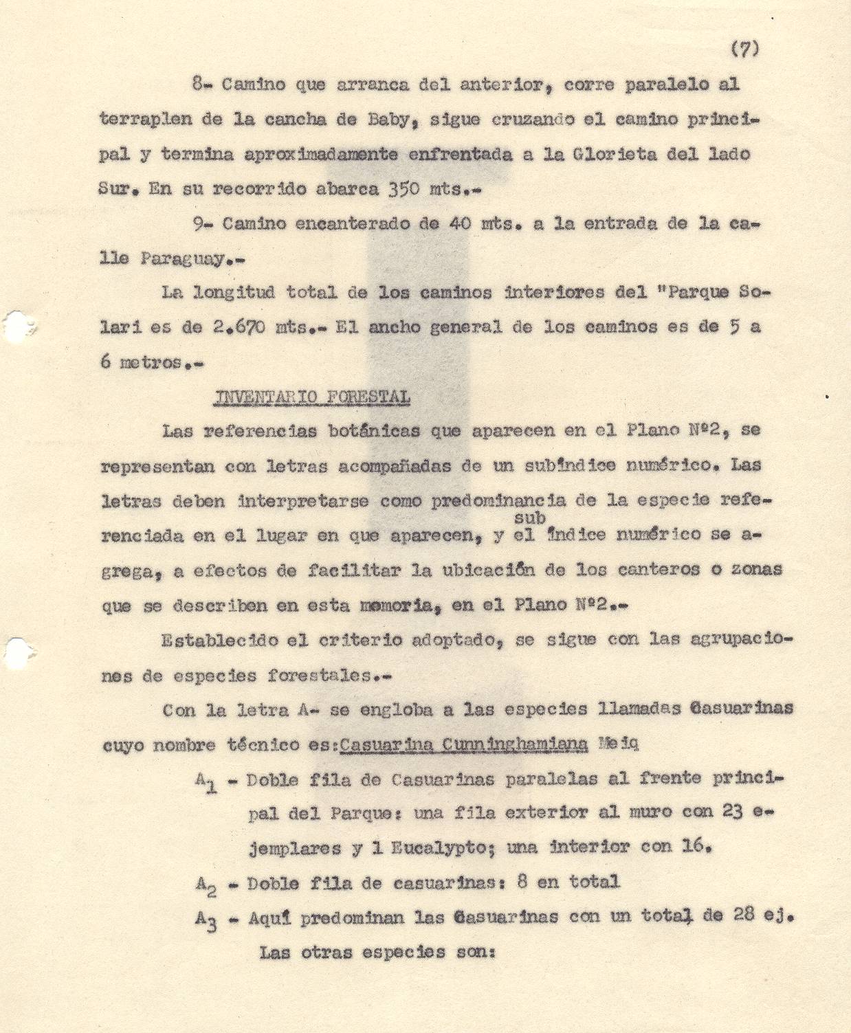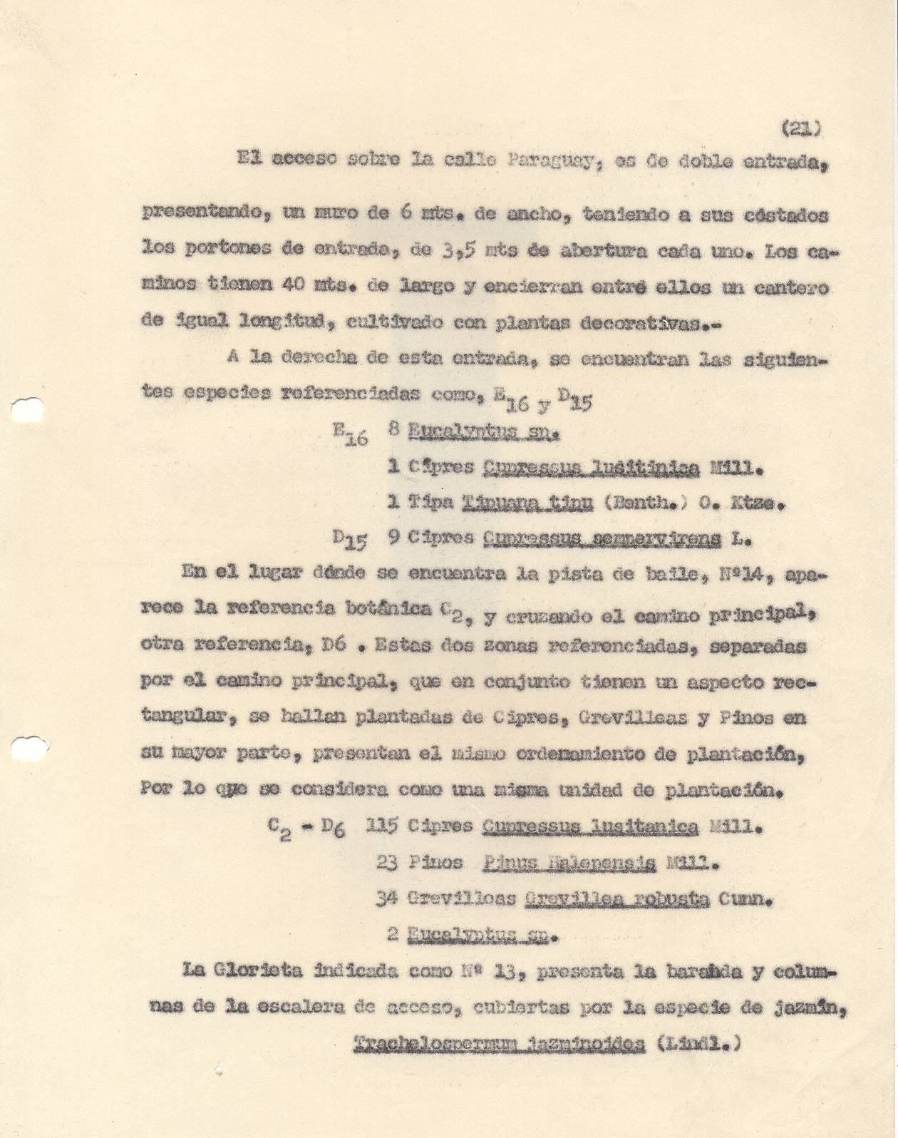ESPECIES VEGETALES. Este parque fue poblado con enormidad de árboles que daban una sombra oscura y tangible. Las especies de árboles elegidas fueron cipreses, pinos, eucaliptos, de perfumes resinosos y persistentes, de grevileas y magnolias de primitivas y antiguas fisiologías botánicas, además de cedros, tipas, casuarinas, varias especies de pino, como los de Aleppo comunes en los paisajes italianos.