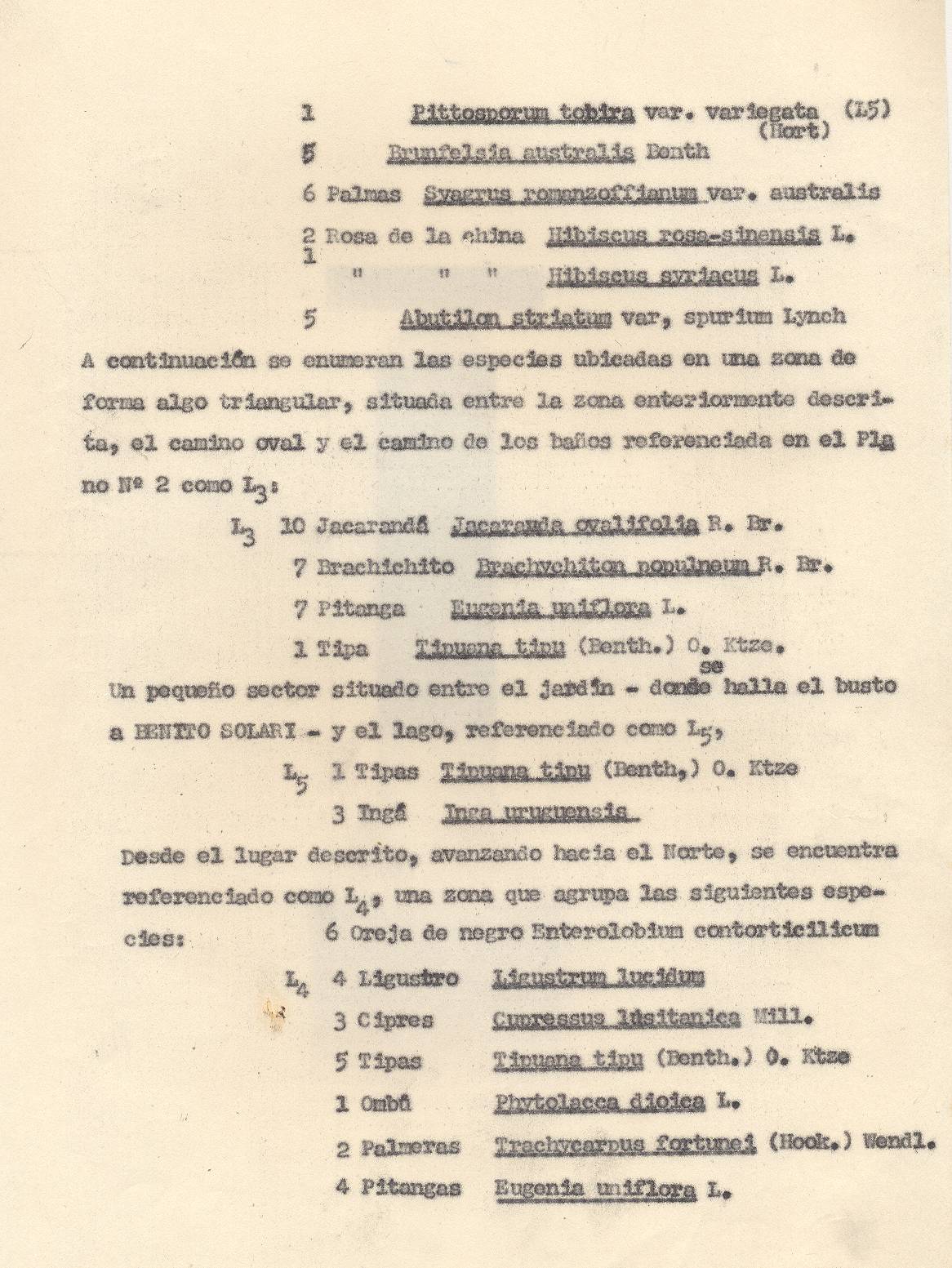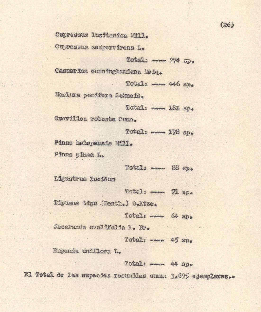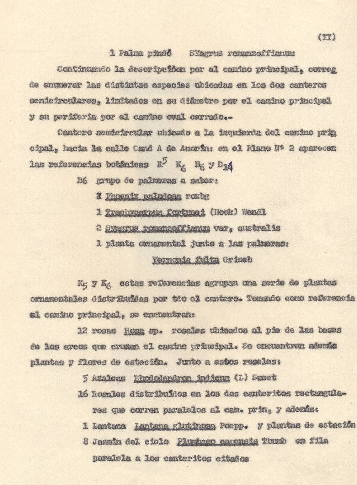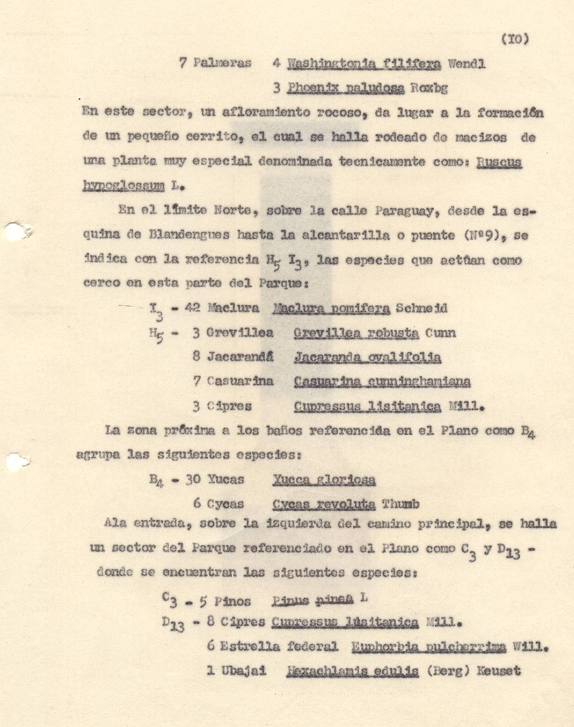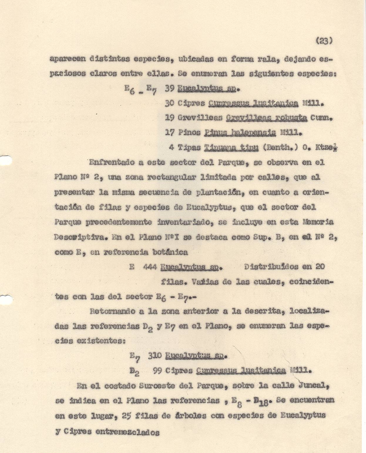 ESPECIES VEGETALES. Este parque fue poblado con enormidad de árboles que daban una sombra oscura y tangible. Las especies de árboles elegidas fueron cipreses, pinos, eucaliptos, de perfumes resinosos y persistentes, de grevileas y magnolias de primitivas y antiguas fisiologías botánicas, además de cedros, tipas, casuarinas, varias especies de pino, como los de Aleppo comunes en los paisajes italianos.
